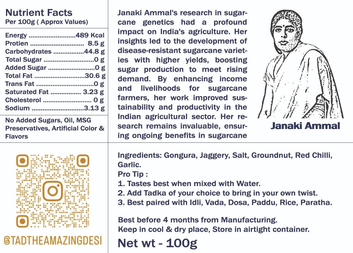 TAD Gongura chutney is an old and traditional side dish from the Indian state of Andhra Pradesh. The main ingredient is Gongura, also known as roselle plant, which is a sour and tangy herb commonly used in South Indian cuisine. The Gongura leaves give the chutney its unique tart and tangy flavour, the groundnut adds a nutty texture & the red chili is a necessary spicy kick. In addition to its delicious taste, Gongura chutney has several health benefits. The Gongura plant contains vitamins and minerals, including vitamin C, iron, and calcium. It is also rich in antioxidants, which can help to boost the immune system, reduce inflammation and protect against free radicals.
