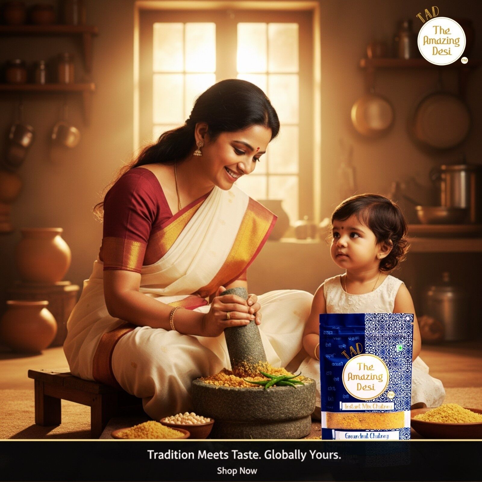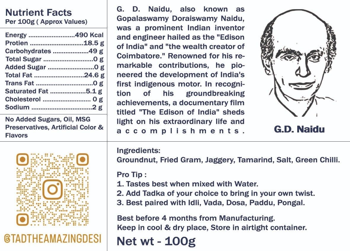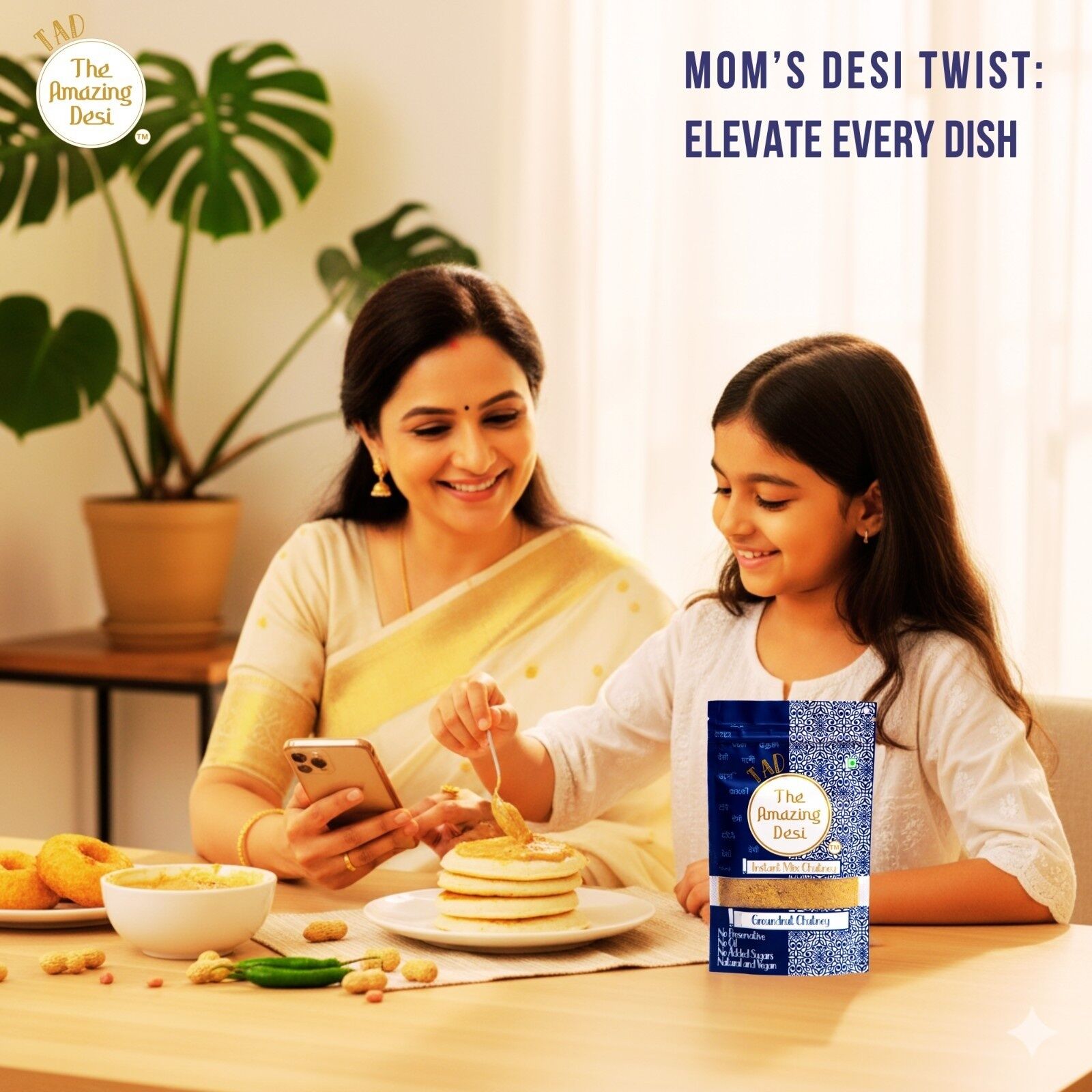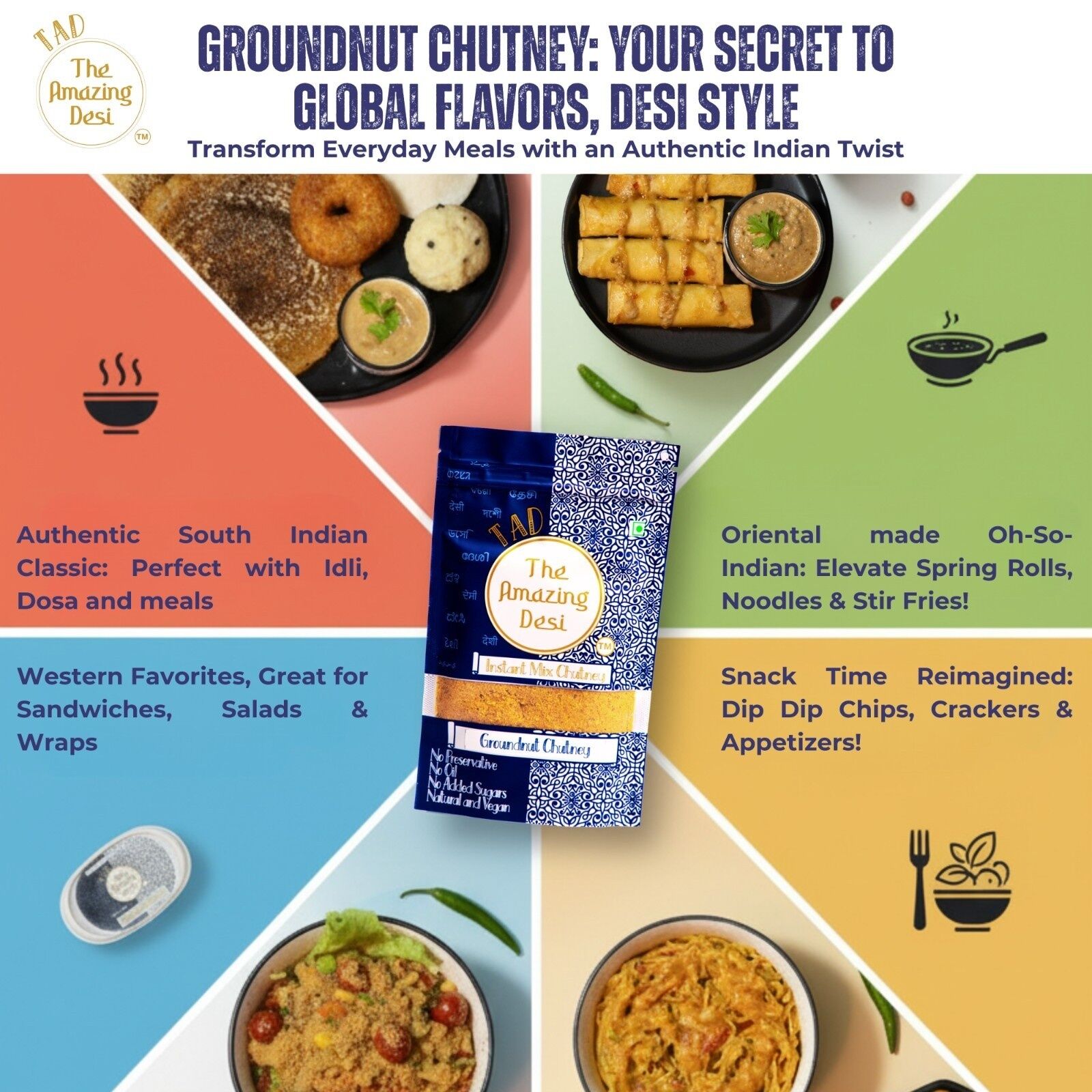 TAD Groundnut Chutney has a mildly sweet taste, a crunchy yet creamy texture, and a tab bit of a spicy kick. This flavourful and instant mix healthy South Indian chutney is a must-have in every kitchen and is most commonly served with idly, dosa, vada, and also enjoyed with a variety of other desi snacks that include samosas, Kachoris, and pakoras. Amazing Desi’s Groundnut chutney is a healthy condiment as it is rich in protein, fibre, and various vitamins and minerals. It is also a good source of healthy fats and has been known to improve heart health. Our Groundnut Chutney is a versatile condiment that adds a unique flavour to any dish.